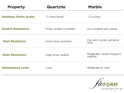 This fundamental difference, quartzite being quartz-based and marble being calcite-based, explains nearly all of their physical contrasts.